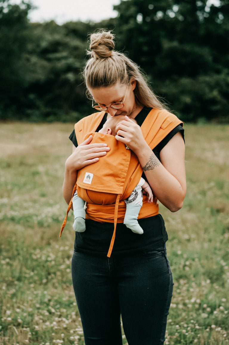Die LIMAS Babytrage ist eine Kombination zwischen Tragetuch und Komforttrage und komplett aus Bio-Tragetuchstoff genäht.