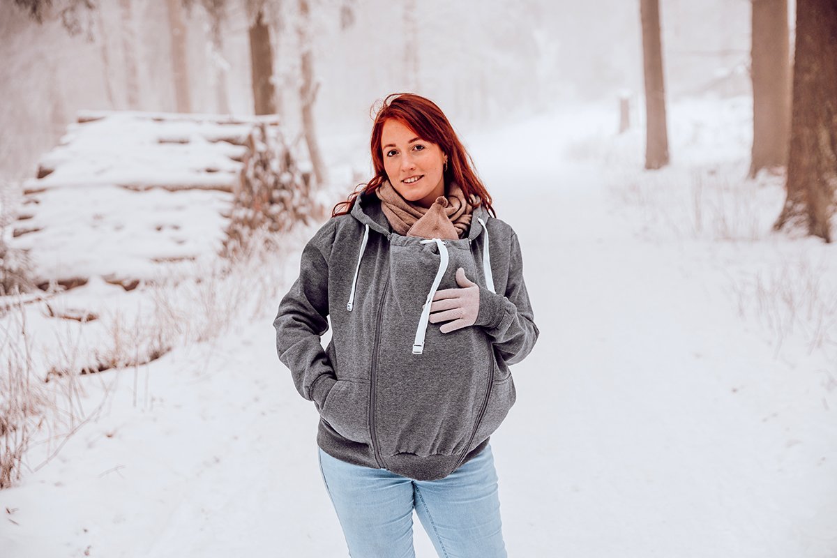 Die Tragesweatjacke kannst du ganz einfach über deine Babytrage ziehen und mit eingesetztem Trageeinsatz wie eine normale Jacke verschließen. Durch Eure Körperwärme können sich dein Baby und du somit gegenseitig wärmen.