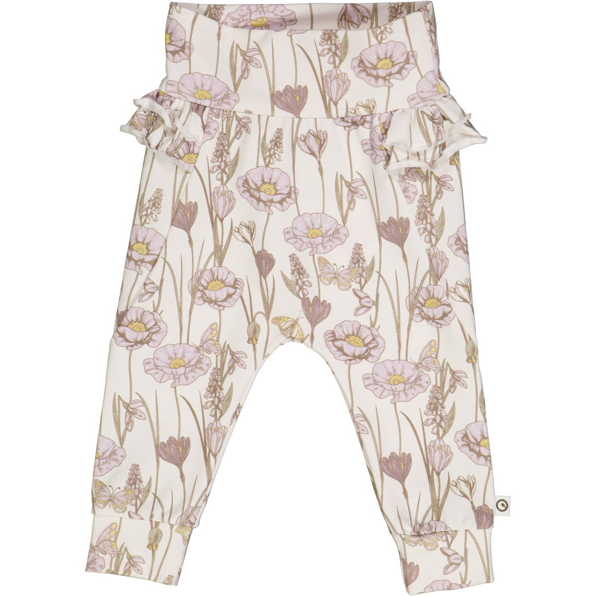 Die Babyhose ist einfach entzückend. Hergestellt aus unserem bedruckten Single-Jersey-Stoff, einer hochwertigen Mischung aus 95% Baumwolle und 5% Elasthan, bietet sie ein leichtes und angenehmes Tragegefühl. Der Stoff hat einen hellbeigen Hintergrund mit einem bezaubernden Muster aus lila und weißen Krokussen, Krokusblüten und Schmetterlingen. Dieses frische und verspielte Design verleiht der Hose einen besonderen Charme. Die Hose hat süße Rüschen-Detail an den Seiten und einen breiten elastischen Bund oben, der dafür sorgt, dass die Hose nicht eng am Bauch sitzt. Sie ist aus einem weichen und dehnbaren Single-Jersey-Stoff mit Elasthan für eine bessere Passform gefertigt.