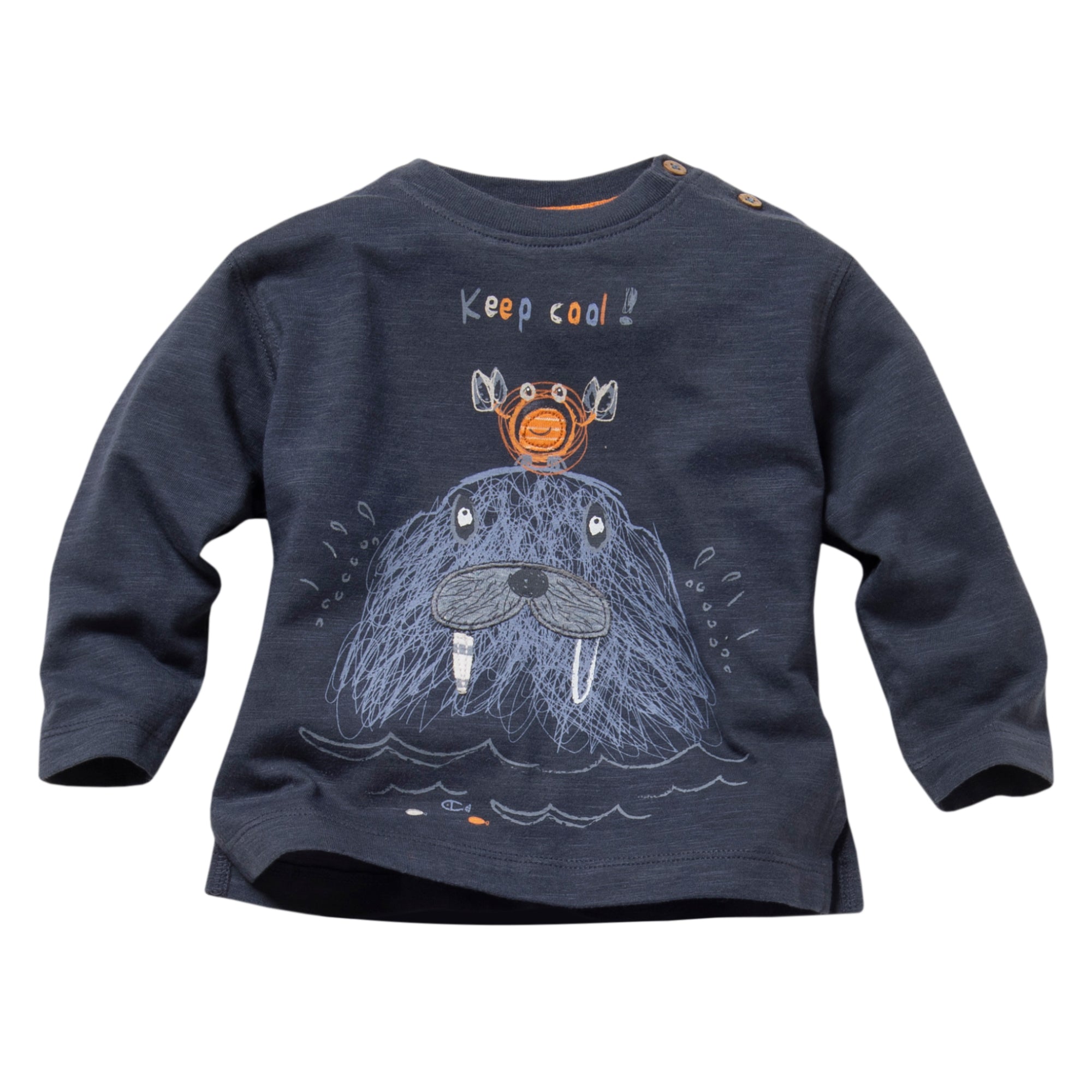 Style dich mit diesem einzigartigen, unbehandelten Bio-Baumwoll Langarm-Shirt in dunkelblau und Applikation Walross. Die Kokosknöpfe an der Schulter erleichtern das An- und Ausziehen. Das Slub Single Jersey Material sorgt für eine lebendige Optik durch verdickte Garne. Knöpfe aus biologisch abbaubarer Kokosnuss. (Wortspiel: "Bio" ist nicht nur für die Baumwolle!)