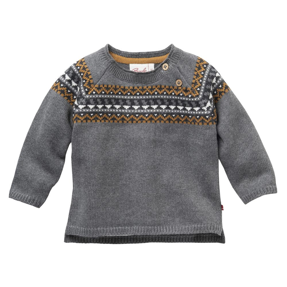 Der nachhaltige Pullover ist geeignet für drinnen und draussen und auch an kalten Tagen noch unter der Jacke tragbar! Klassisches Design mit zartem Norweger-Muster. Zwei Kokosnuss Knöpfe sorgen für das einfache Schließen.