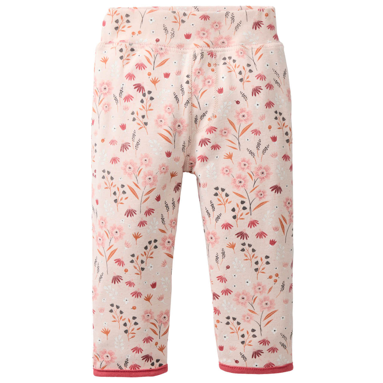 Die eine Seite der Wendehose ist beige bedruckt mit "Winterblumen" Motiv und die andere Seite rorange bedruckt mit Tupfen.