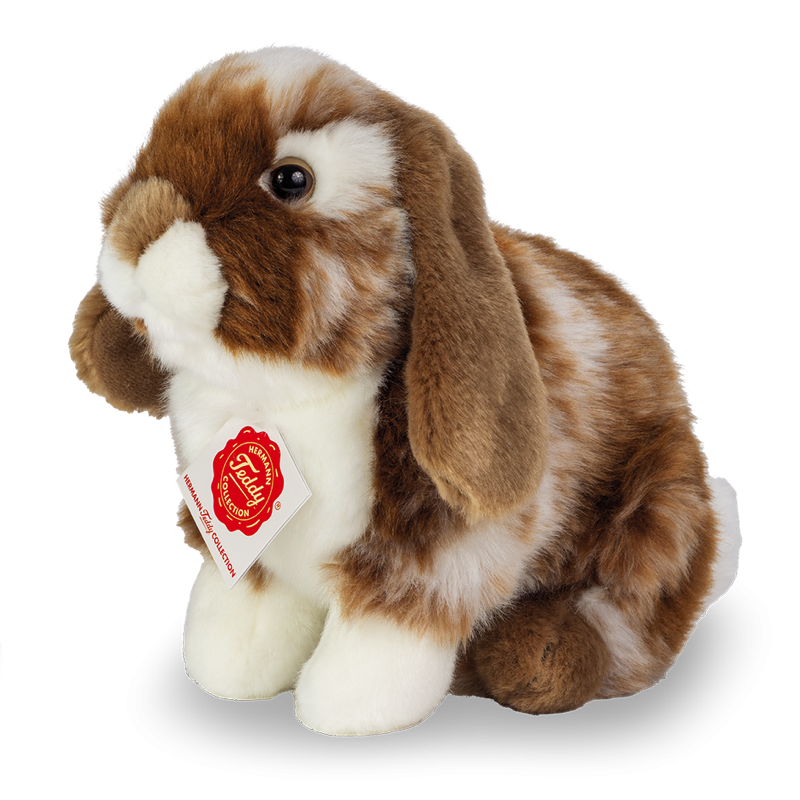 Mit diesem Artikel bekommen Sie einen sehr lieben und freundlich schauenden Hasen. Weiße Brust, Näschen und vordere Pfötchen unterscheiden sich von seinem restlichen dunkelbraun/ weiß gescheckten Fell und verleihen ihm eine besondere Eleganz. Die langen Hasenohren sind nach unten gesenkt, die Pfoten sowie das Schwänzchen unter dem Körper vereint. Der Hase ist ganz entspannt und freut sich auf seinen neuen Besitzer.
