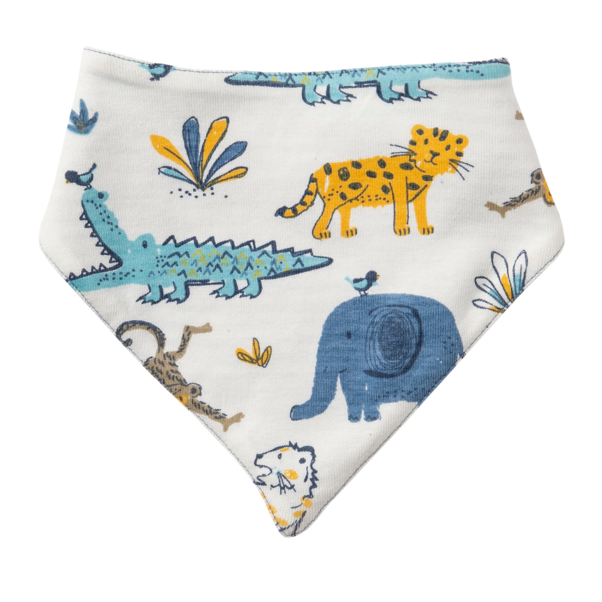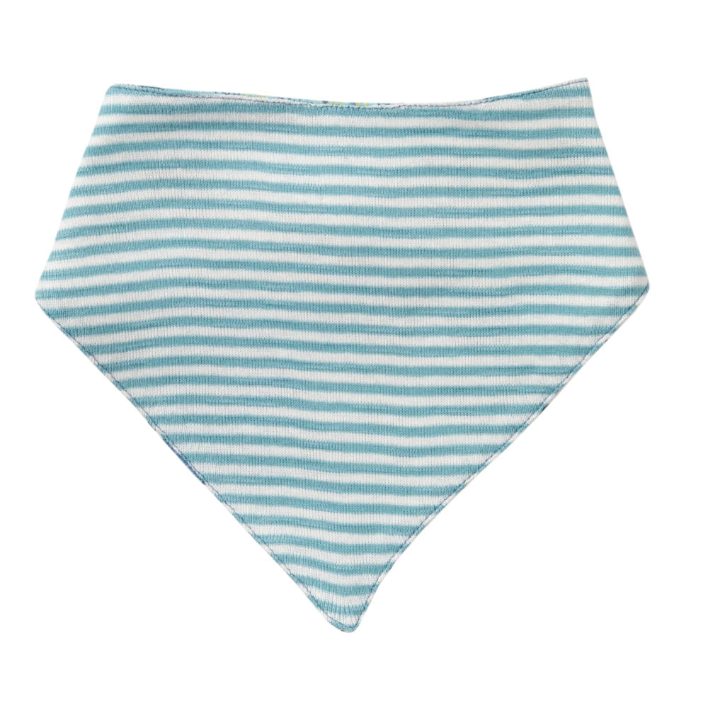Das Tolle daran sind die 2 Designs: Eine Seite mit Streifen und die andere Seite mit detailverliebtem Motivdruck "Savanne" auf weißem Grundstoff. Die 2-fach verstellbaren nickelfreien Druckknöpfe sorgen für einen guten Sitz und das Kindertuch wächst prima mit.