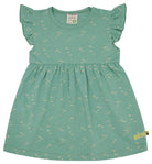 Kleid aus Slub Jersey mit ganzflächigem Druck (Wasserbasierender Druck). In der Taille gerüscht. Armausschnitt mit gerüschen Flügelärmelchen. Logo-Etikett mit Fähnchen an der Seitennaht. Made in Portugal. Waschbar bei 30°C.