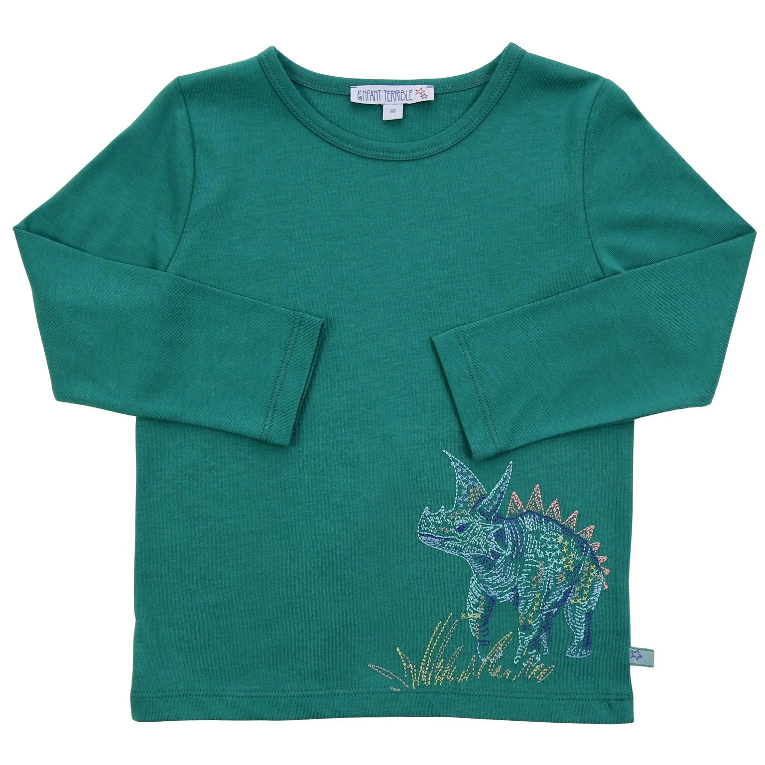 Dino-Alarm! Das smaragdgrüne Langarmshirt begeistert mit einem detailreich gestickten Triceratops – perfekt für kleine Dinosaurierfans!