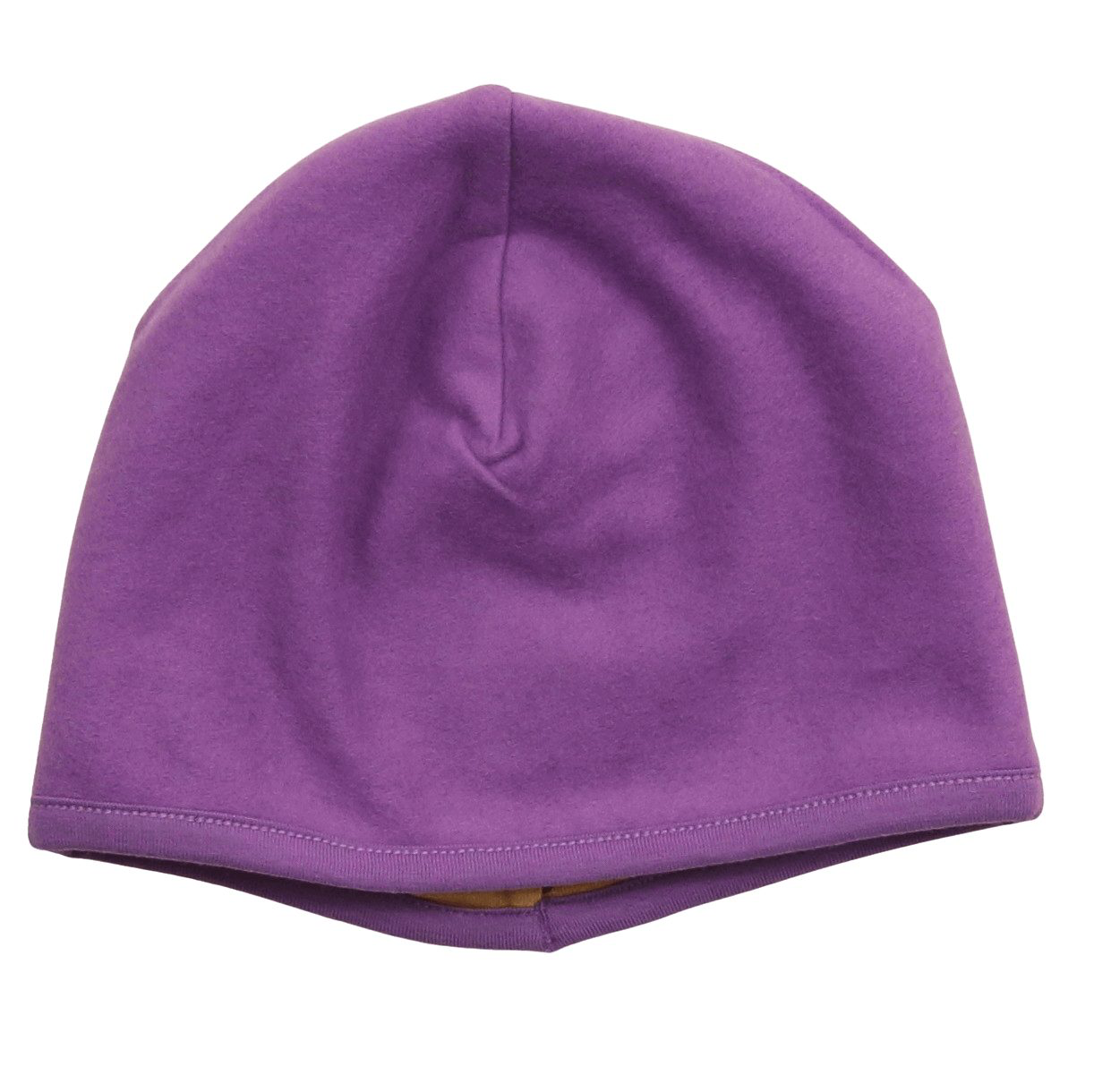 Die lila Innenseite der Mütze ist kuschelig weich angeraut und hält so auch an kalten Tagen schön warm.