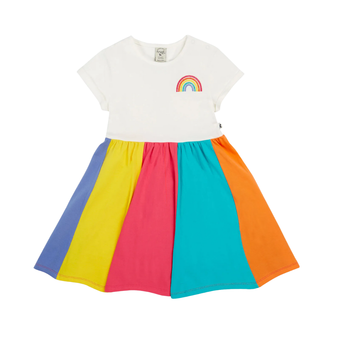 Bereit für das Drehen in Sommerpartys! Unser Rainbow Jerseykleid ist aus weicher und atmungsaktiver, GOTS-zertifizierter Bio-Baumwolle gefertigt. Mit Druckknopfverschlüssen an der Schulter für einfaches Anziehen hat dieses Kinderkleid ein hübsches, gesticktes Patch auf der Brust und Raffungen an der Taille.