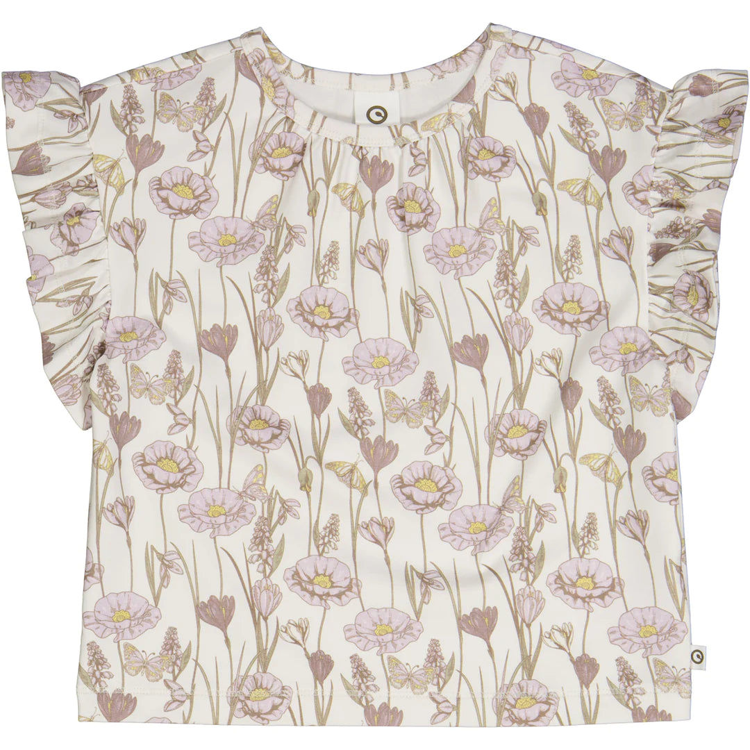 Unser bedrucktes T-Shirt für den Sommer begeistert mit einem wunderschönen Blumenmuster und kurzen Ärmeln. Der Single-Jersey-Stoff ist ein Digitaldruck und besteht aus einer hochwertigen Mischung aus 95% Baumwolle und 5% Elasthan. Mit einer Grammatur von 180 g/m² bietet er ein leichtes und angenehmes Tragegefühl. Der Stoff präsentiert einen hellbeigen Hintergrund, der mit einem zauberhaften Muster aus lila und weißen Krokussen, Krokusblüten und Schmetterlingen versehen ist. Dieses bezaubernde Design verleiht dem Produkt einen frischen und verspielten Touch. Das T-Shirt ist weit und kurz geschnitten und verfügt über niedliche Volants an den Ärmeln. Hergestellt aus weichem und dehnbarem Single-Jersey mit Elasthan, bietet es eine bequeme Passform für den ganzen Tag.