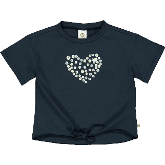 Dieses T-Shirt besticht durch seine kurzen Ärmel und einen gebundenen Knoten an der Vorderseite. Auf der Vorderseite ist ein feines Herz aus Blumen aufgedruckt, das dem Design eine besondere Note verleiht. Durch den Knoten ist das T-Shirt vorne kürzer als hinten, was für einen modischen und zugleich praktischen Look sorgt.
