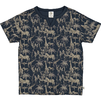Das T-Shirt zeigt einen feinen Allover-Print mit Savannentieren, inspiriert von einer Safari. Der Print ist in hellem Beige auf einem dunkelblauen Hintergrund gestaltet.
