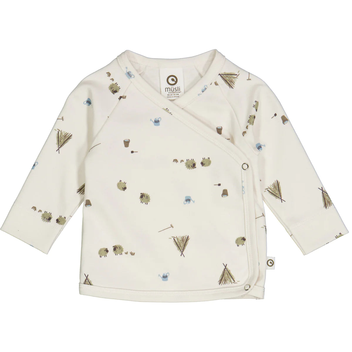 Entdecken Sie unsere bezaubernde Babystrickjacke aus bedrucktem 2x2-Rippstoff mit einer Grammatur von 220 g/m². Hergestellt aus 100% Baumwolle, bietet dieser Stoff eine optimale Kombination aus Komfort und Qualität. Der hellbeige Hintergrund wird von niedlichen Bauernhofmotiven wie Schafen, einem Rechen, einem Heuhaufen und einem Kübel geschmückt, die der Jacke einen rustikalen und charmanten Touch verleihen.