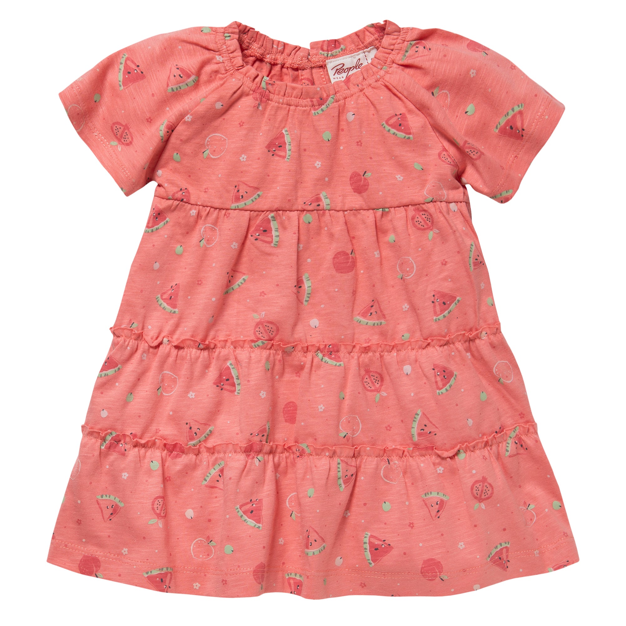 Klassisch florales Design. Der Schnitt ist lang und luftig,fällt am Bein lang aus, Knopf im Nackenbreich für leichteres An- und Ausziehen. Zuckersüßes gerüschtes Stufenkleid aus den AOP-Stoffen mit Sommerfrüchten.