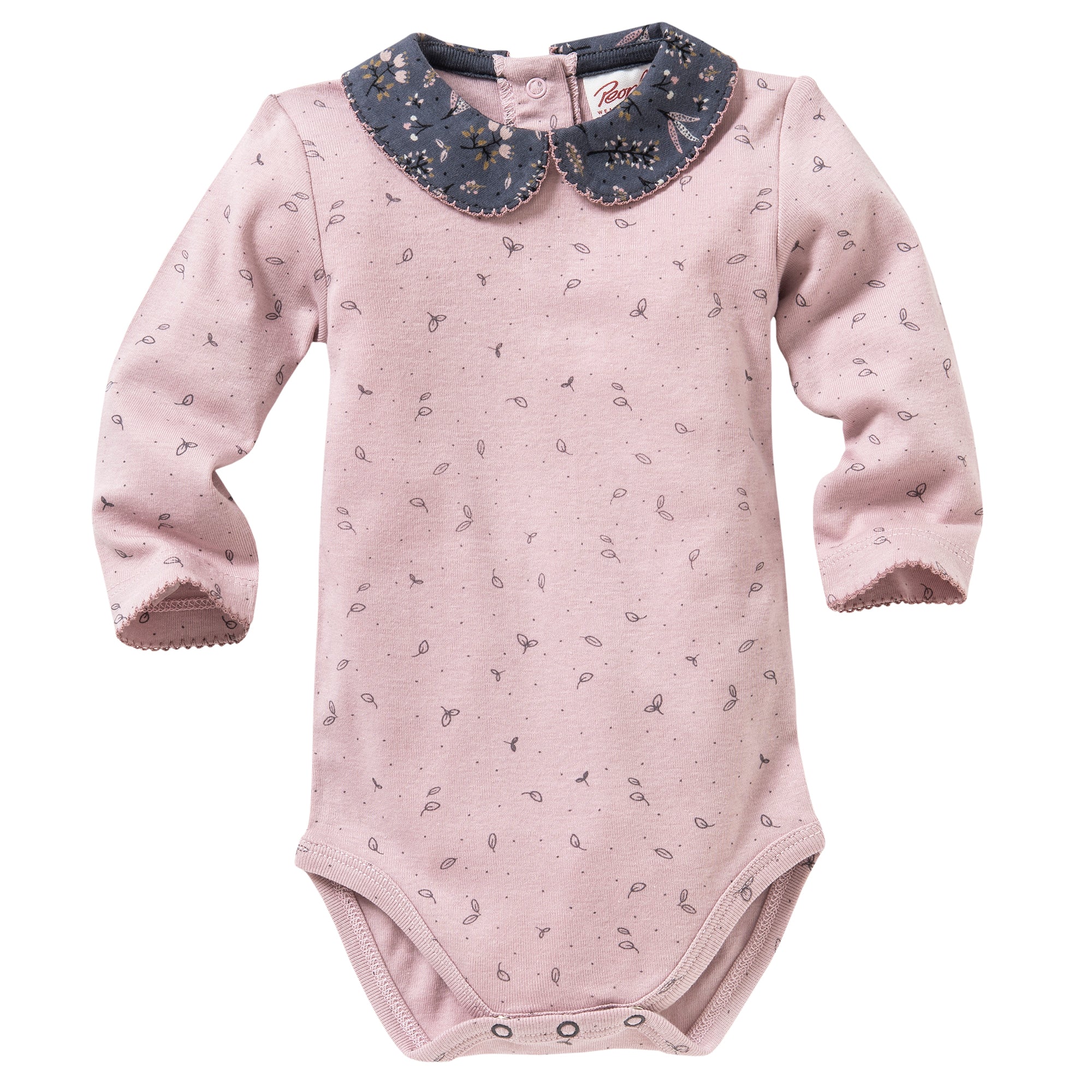 Langarm-Body mit Kragen blass violett mit dezentem Blätterdruck, Kragen bedruckt mit Blätter- und Blütenmuster, Kragen und Armabschluss mit Häkelkante verziert, Knopfleiste hinten, farblich abgesetzte Druckknöpfe