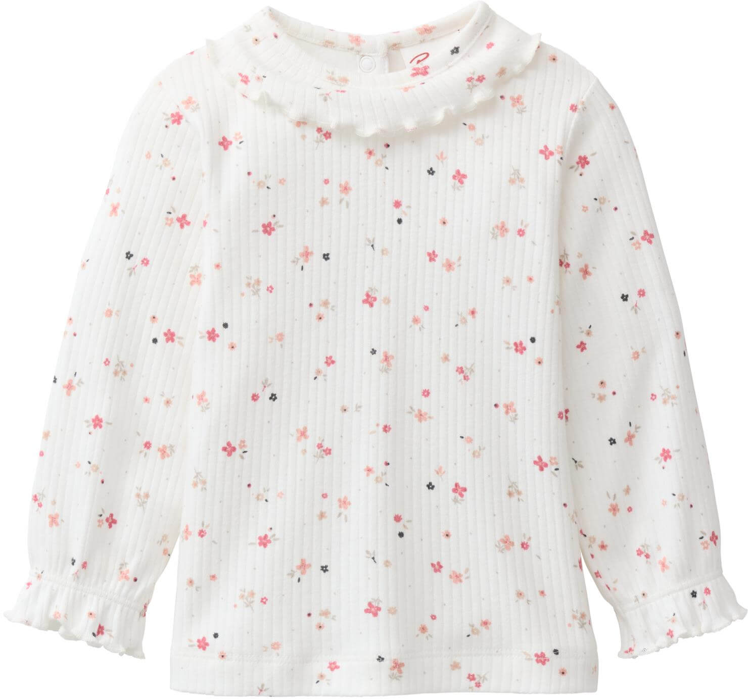 Auf diesem Rippshirt wird's verspielt. Der dezente Blumendruck sorgt zusammen mit den Rüschen am Halsausschnitt und Ärmelsaum für einen Hauch Romantik und das frische Weiß lädt zum Kombinieren ein.
