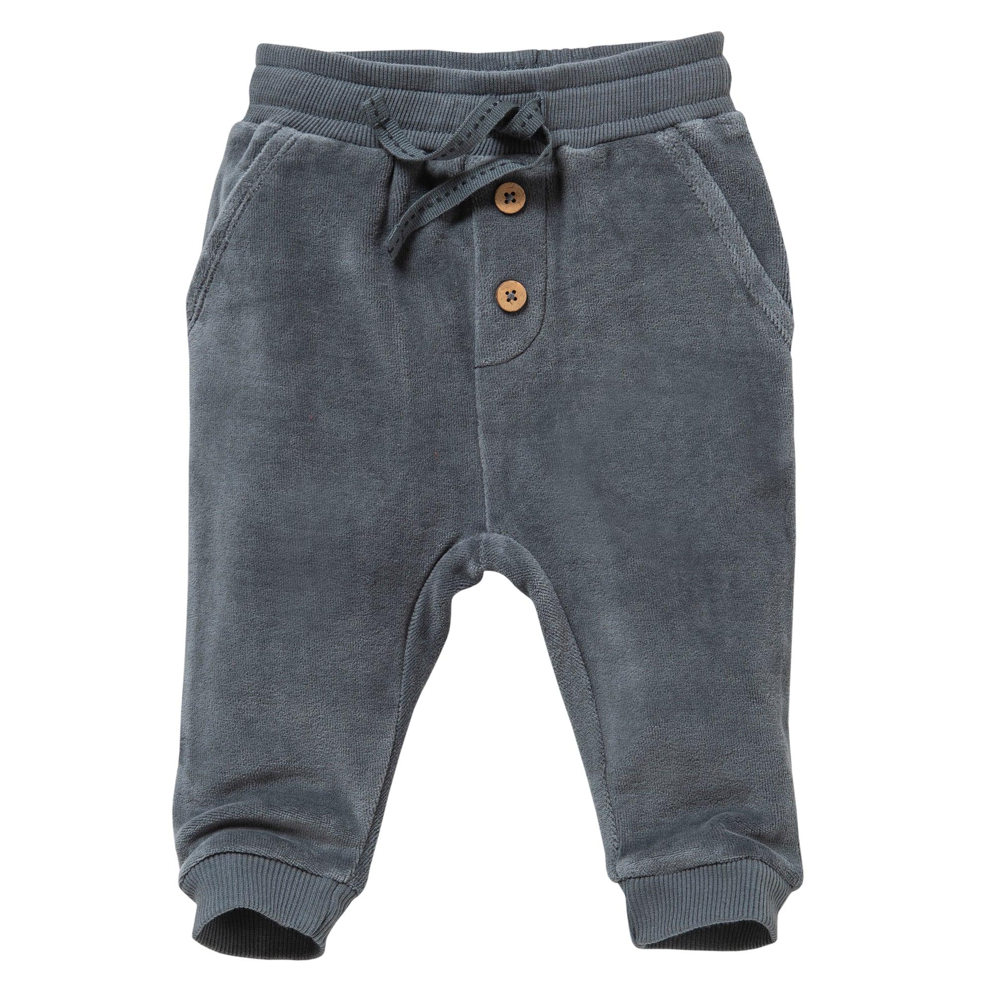 Die Nicki-Hose in ozean hat Rippbündchen am Hosensaum und Bund sowie Eingriffstaschen und ein Bindeband für verstellbare Bundweite. Eine Absteppung vorn deutet einen Reißverschluss an. Zwei Kokosknöpfe dienen als dekoratives Element.