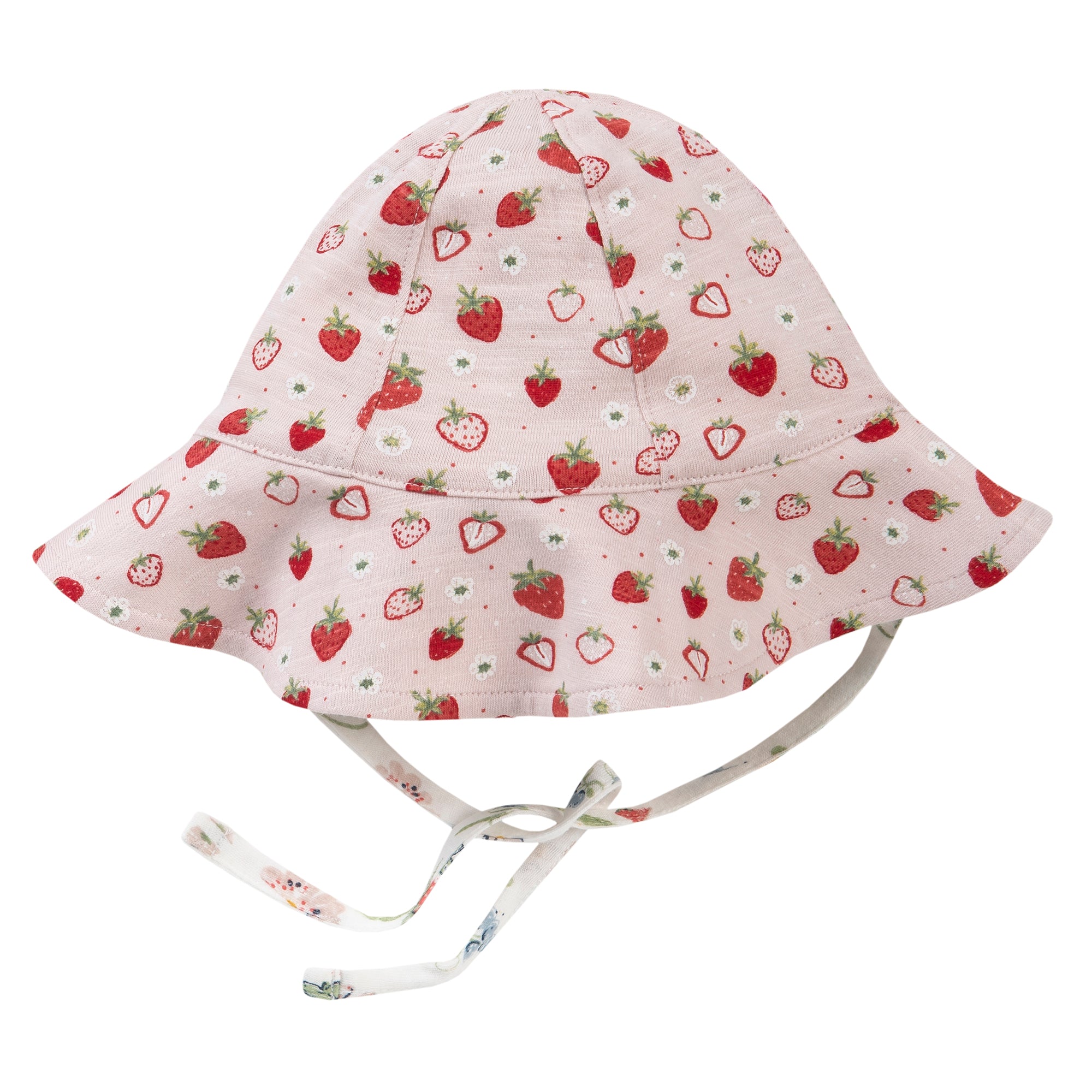 Der Sonnenhut mit Bindeband ist ein wertvoller Begleiter an sonnigen Tagen. Er hat einendetailverliebten All-over-Print "Erdbeere" auf hellrosa Grundstoff und eine Zierschleife.