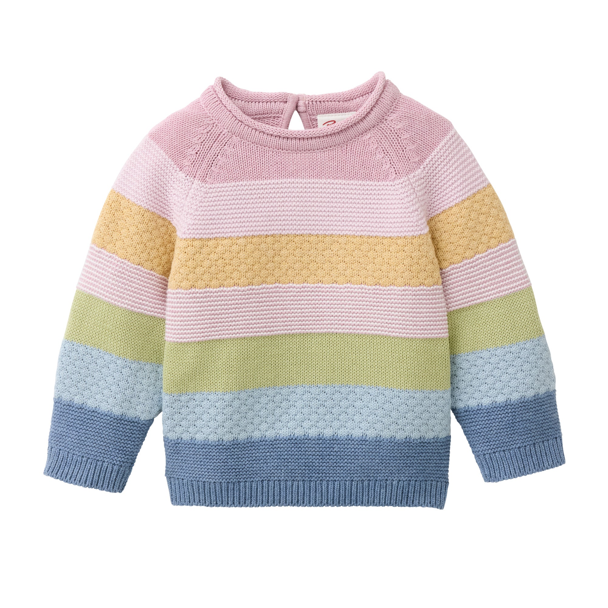 Was gibt es fröhlicheres als einen Regenbogen? Einen Regenbogenpulli! In soften Farben und mit unterschiedlichen Struktur-Strick-Varianten bleibt es mit diesem neuen Lieblingsstück immer spannend. Mit Kokosknopf für leichtes An- und Ausziehen.