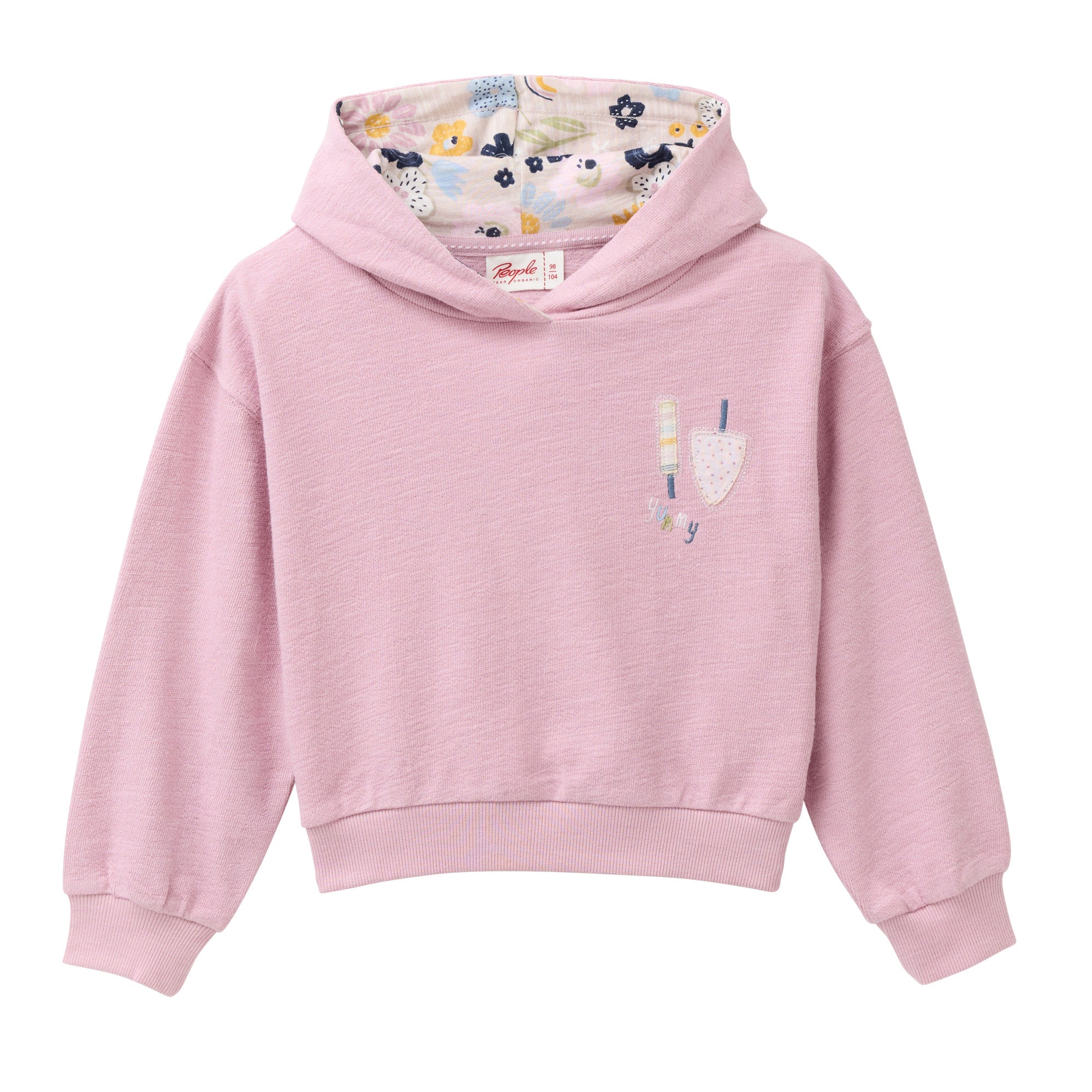 Dieser Pulli mit lässig überschnittenen Schultern ist ein Sommertraum zum Einkuscheln: weicher Bouclé Sweat, Blumendruck im Kapuzenfutter und Eisapplikation. Für unendlich lange Sommernächte.