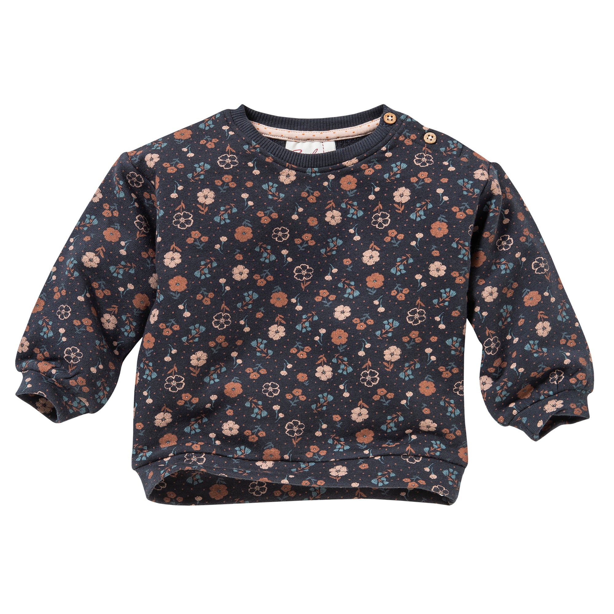 Der süße Sweat-Pullover in nachtblau ist komplett mit Blümchenmuster bedruckt. Durch die überschnittene Schultern hat er einen lässigen Sitz. Kokosknöpfe an der linken Schulter sorgen für leichtes An- und Ausziehen.