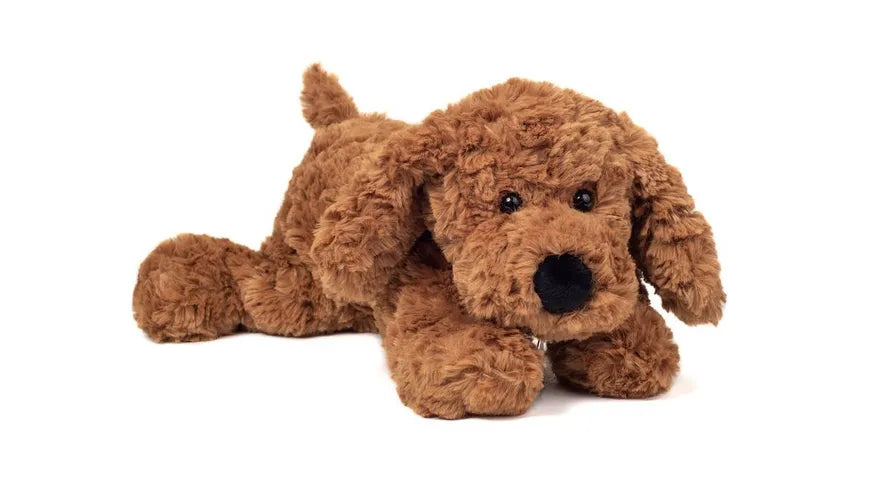 Das Spielzeug ist 28 cm groß, hat kleine Augen, schwarze Schnauze und lange Ohren. Sein Fell ist kuschelig und flauschig, die Pfoten sind mit kleinen Granulat-Säcken gefüllt, um dem Hund eine angenehme Schwere zu geben.