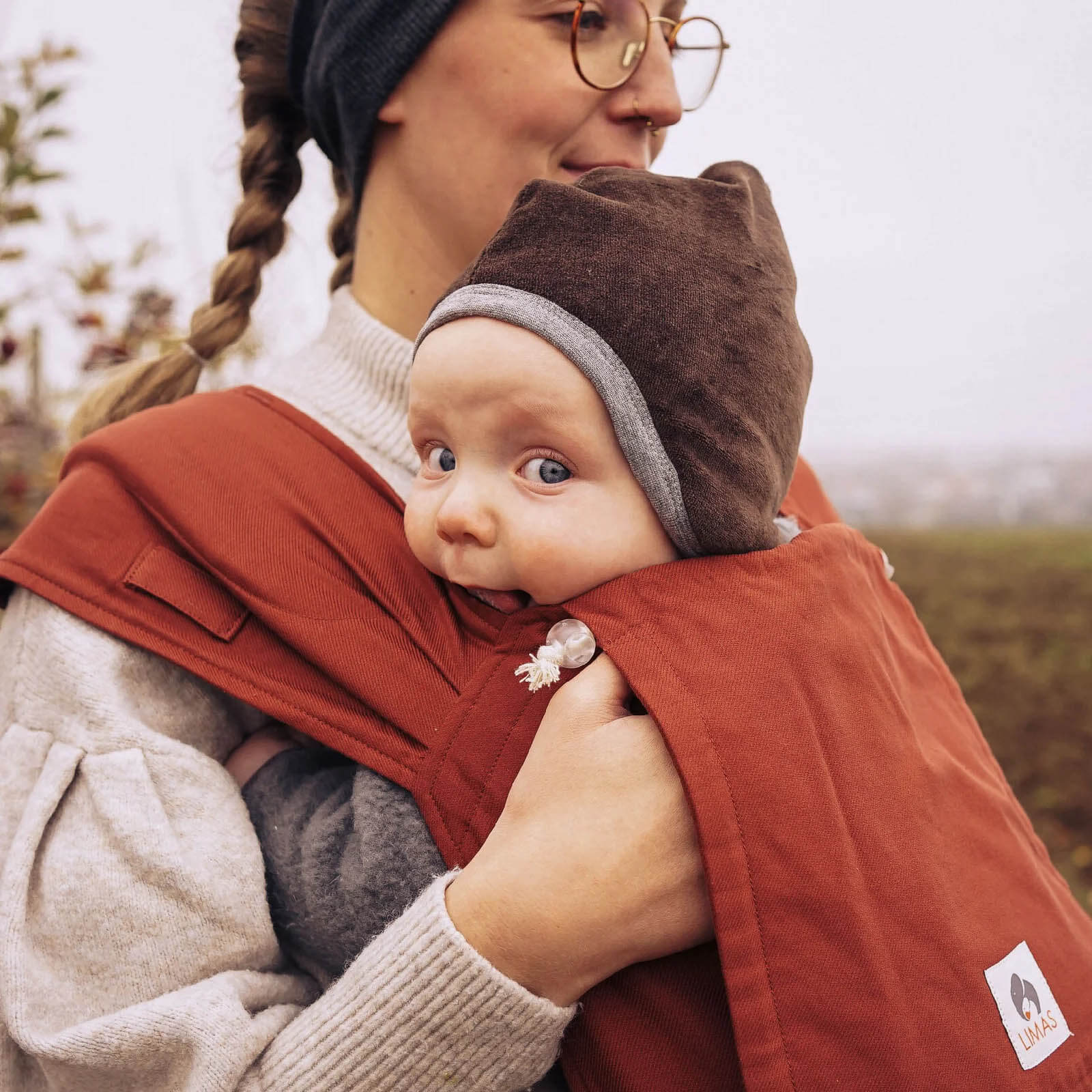 Die LIMAS Babytrage ist eine Kombination zwischen Tragetuch und Komforttrage und komplett aus Bio-Tragetuchstoff genäht.