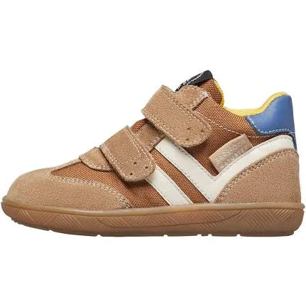 Barfußschuhe mit Obermaterial aus Stoff, ergänzt durch Einsätze aus Veloursleder in der Farbe und kontrastierendem Leder an den Seiten. Sie werden mit einem doppelten Riemen geschlossen und haben ein Innenfutter und eine Innensohle aus Stoff sowie eine Gummisohle mit verstärkter Zehenkappe.