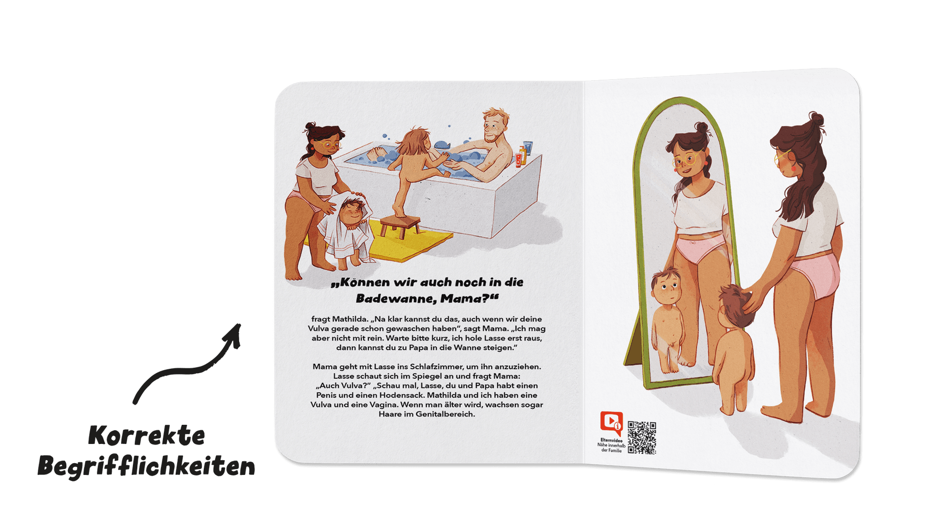 In den Büchern findet ihr QR-Codes. Hinter denen sich Erklärvideos zu den Inhalten der jeweiligen Seiten verbergen. Die Videos unterstützen dabei, die richtigen Worte für die frühkindliche Aufklärung zu finden.