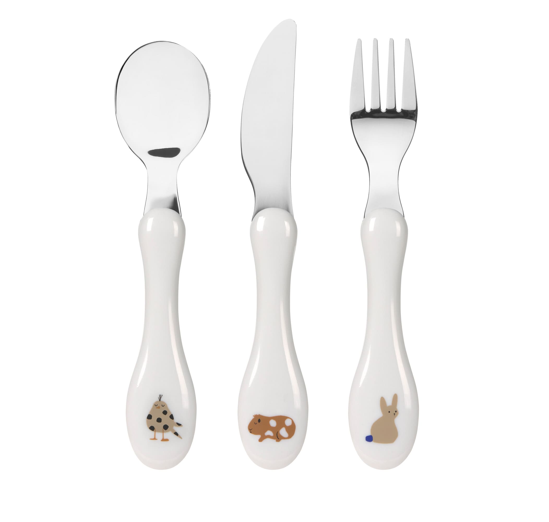 Das Kinderbesteck Set aus Gabel, Löffel undMesser ist BPA-frei und aus rostfreiem, nicht verformbarem Edelstahl mit Griffen aus Kunststoff.
