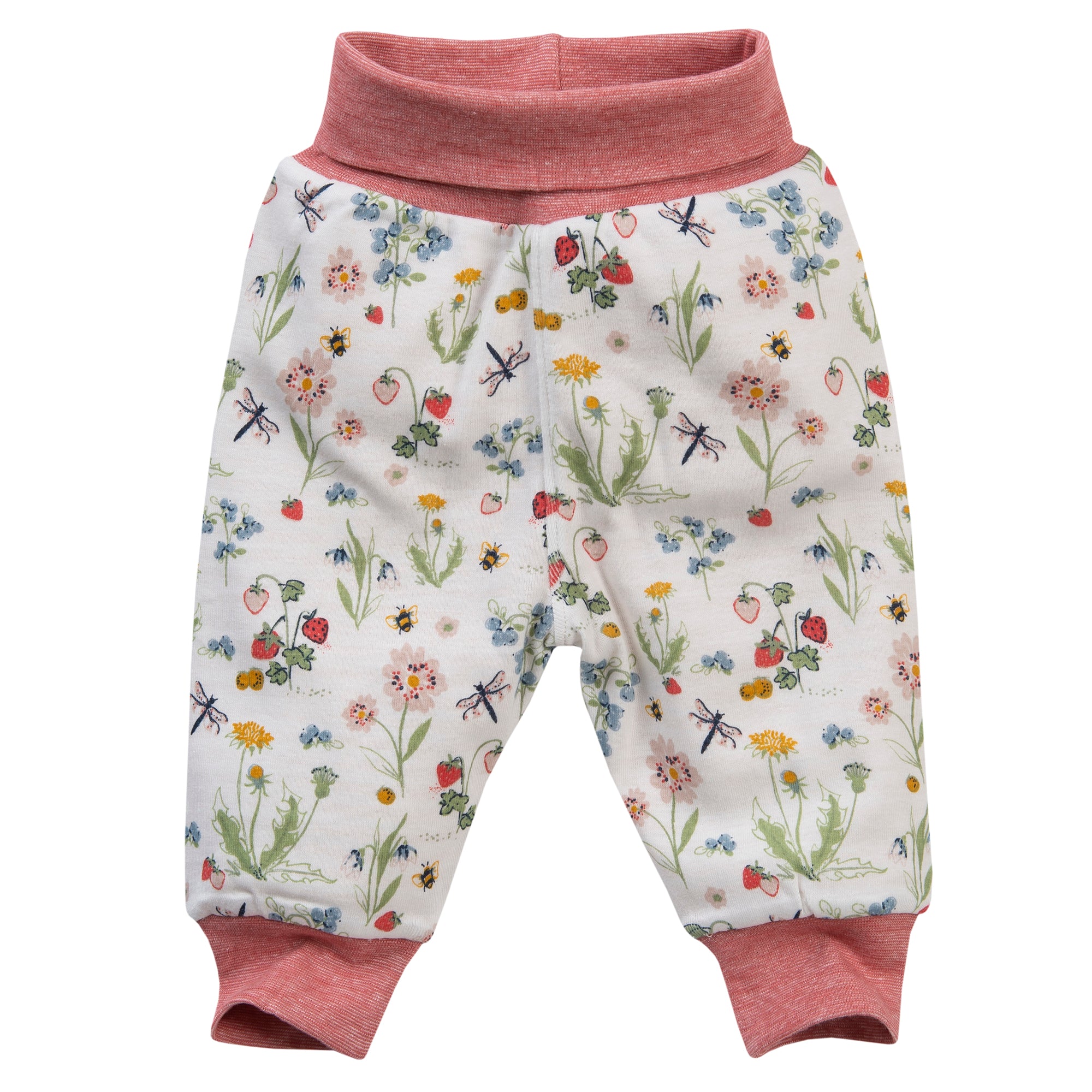 People wear organic warme Bio Babyhose zum Wenden mit Alloverprint Obstgarten weiß