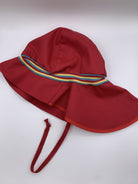 Mit Bindebändern und einer breiten Krempe versehen, sitzt der Sonnenhut FEUERWEHR STRICK mit Nackenschutz von PICKAPOOH gut und spendet angenehmen Schatten. Das Rippstrickbündchen schmiegt sich rundherum elastisch an, sodass der Hut nicht rutscht. Der Stoff aus Bio-Baumwolle ist schön fest, dicht gewebt und leicht.